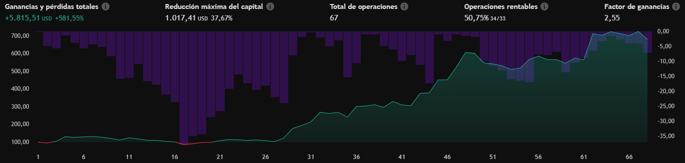 A continuación podemos ver su comportamiento testeado para este periodo en Tradingview con el bot, donde con una inversión inicial de 1000$ se ganó 5.815,51$: