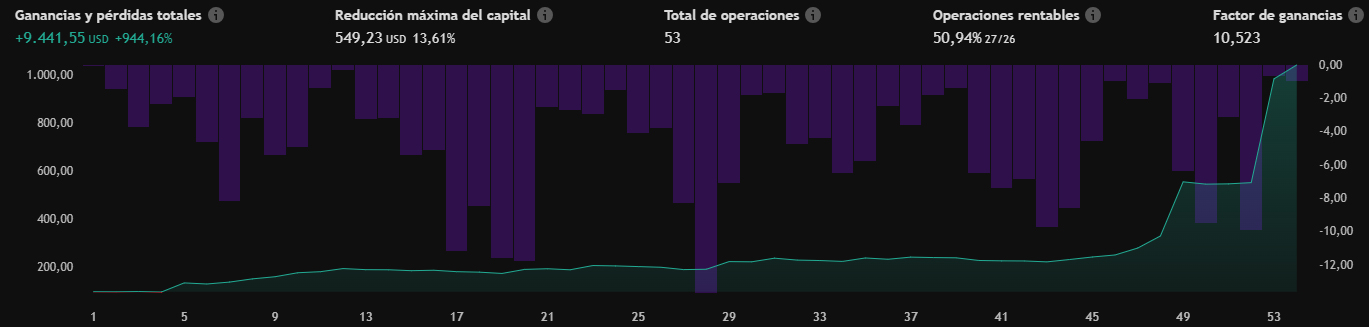 A continuación podemos ver su comportamiento testeado para este periodo en Tradingview con el bot, donde con una inversión inicial de 1000$ se ganó 9.441,55$: