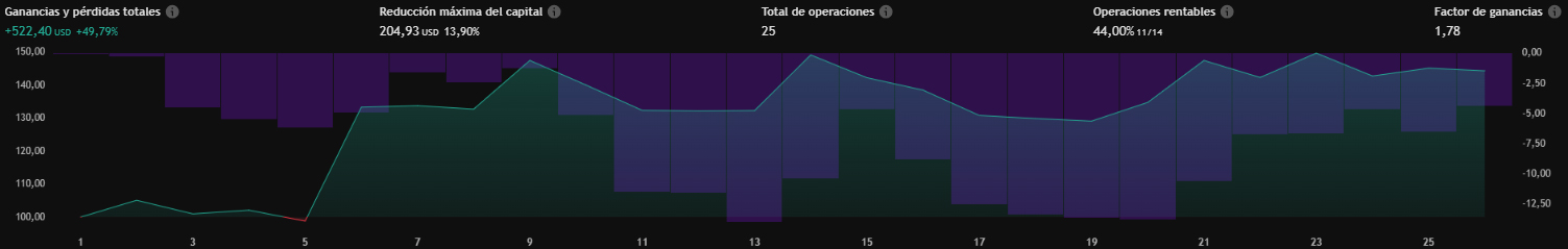 La estrategia ha sido testeada (backtesting) de forma privada y con TradingView, una de las mejores plataformas de trading, ampliamente utilizada por traders de todos los niveles. Se realizaron pruebas para confirmar que las señales coinciden con las del testeo y que el proceso de operación es consistente.