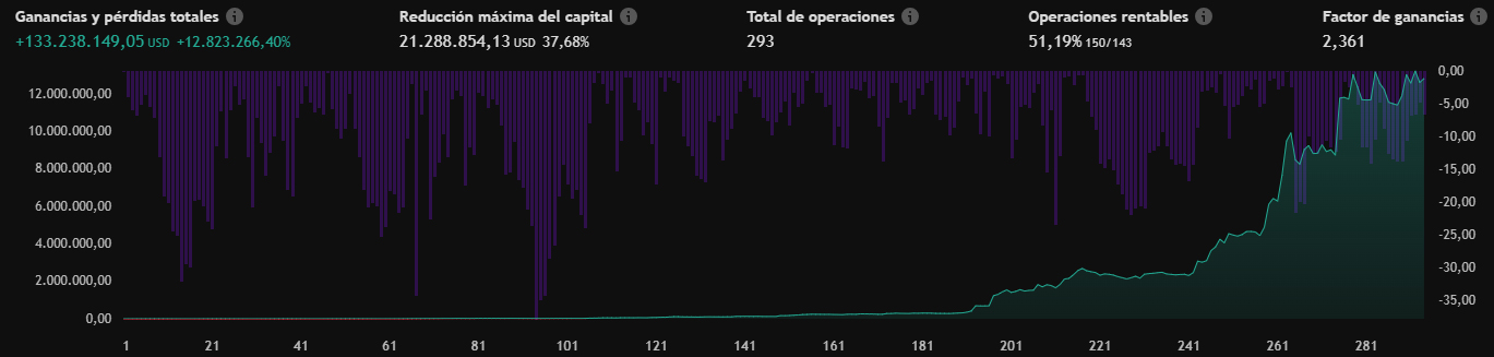 A continuación podemos ver su comportamiento testeado para este periodo en Tradingview con el bot, donde con una inversión inicial de 1000$ se ganó 133 millones de dólares aproximadamente: