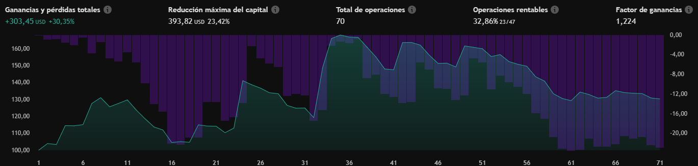 A continuación podemos ver su comportamiento testeado para este periodo en Tradingview con el bot, donde con una inversión inicial de 1000$ se ganó 303,45$: