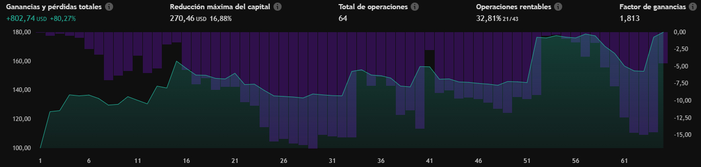 A continuación podemos ver su comportamiento testeado para este periodo en Tradingview con el bot, donde con una inversión inicial de 1000$ se ganó 802,74$: