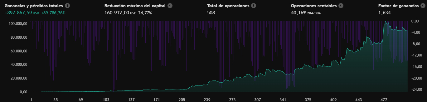 A continuación podemos ver su comportamiento testeado para este periodo en Tradingview con el bot, donde con una inversión inicial de 1000$ se ganó 897.867,59$: