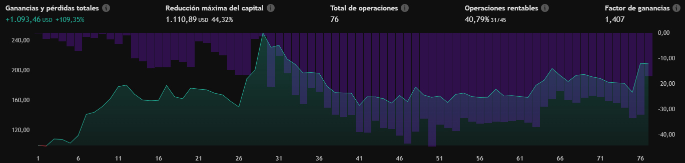 A continuación podemos ver su comportamiento testeado para este periodo en Tradingview con el bot, donde con una inversión inicial de 1000$ se ganó 1.093,46$: