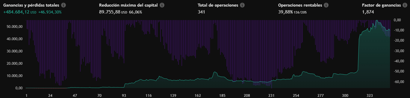 A continuación podemos ver su comportamiento testeado para este periodo en Tradingview con el bot, donde con una inversión inicial de 1000$ se ganó 484.684,12$: