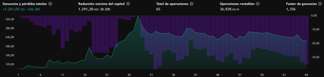 A continuación podemos ver su comportamiento testeado para este periodo en Tradingview con el bot, donde con una inversión inicial de 1000$ se ganó 1.261,05$: