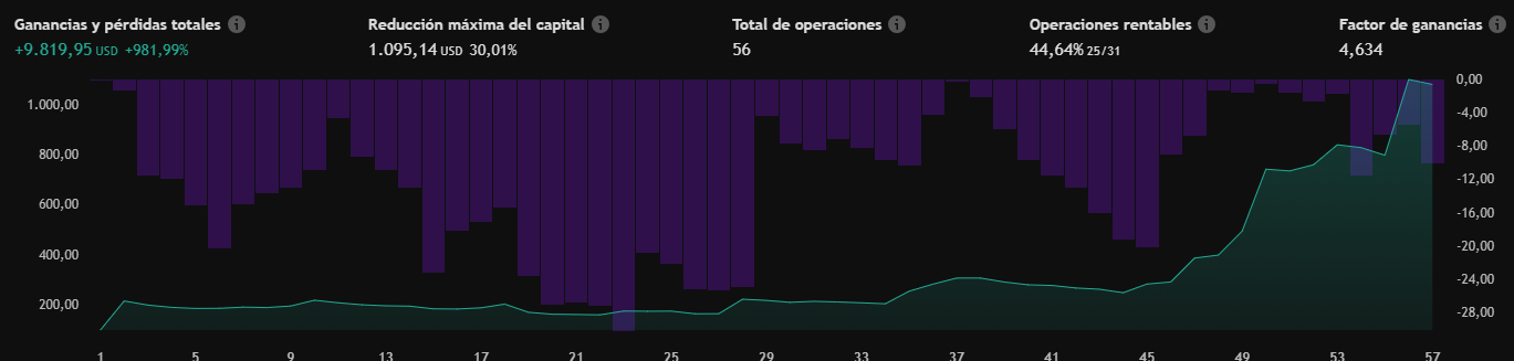 A continuación podemos ver su comportamiento testeado para este periodo en Tradingview con el bot, donde con una inversión inicial de 1000$ se ganó 9.819,95$: