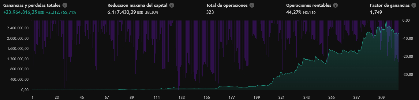 A continuación podemos ver su comportamiento testeado para este periodo en Tradingview con el bot, donde con una inversión inicial de 1000$ se ganó 23 millones de dólares aproximadamente: