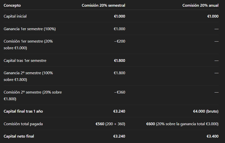 Ejemplo de un ejercicio anual: mostramos el resultado aplicando la comisión de forma semestral y, a modo comparativo, cómo sería si se cobrara una única vez al año. Esto se incluye solo para ilustrar que no se está cobrando un 40% anual, y que la diferencia con cobrar una sola vez el 20% no es muy significativa.