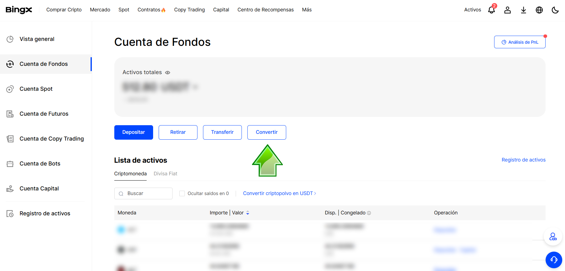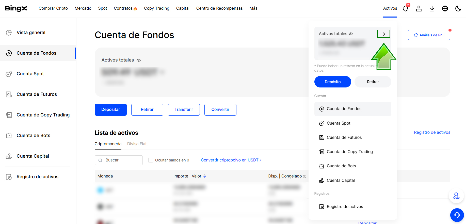 1º Hacemos hover (pasar ratón sobre) Activos en el menú superior (siguiente imagen) y hacer click sobre la flechita que indica la flecha verde en la imagen. Nos llevará a la página de Activos y en el menú de la izquierda pulsamos Cuenta de Fondos.