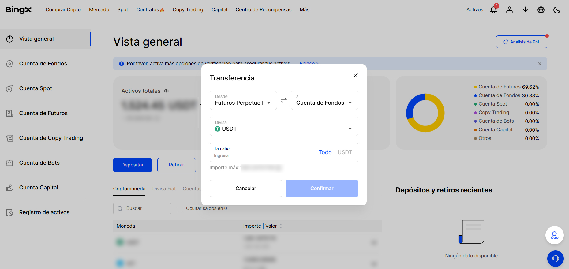 2º Si no disponemos de USDT o USDC en la Cuenta de Fondos, debemos hacer clic en Transferir para mover fondos desde la Cuenta de Futuros Perpetuos USD hacia la Cuenta de Fondos, ya que el bot opera en la sección de Futuros Perpetuos USD. Seleccionamos: origen Futuros Perpetuos USD / destino Cuenta de Fondos, indicamos la cantidad de USDT a transferir y pulsamos en Confirmar.