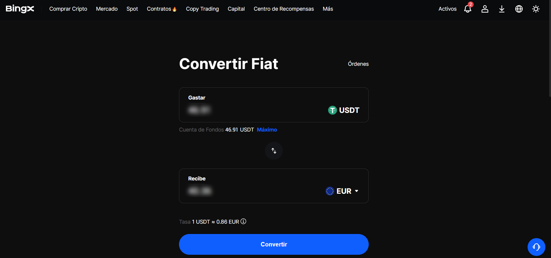 4º En la nueva página, seleccionamos convertir USDT a EUR, el mínimo que permite transferir son 30$ con una comisión de 2$ si la transferencia es menor a 2000$. Pulsamos Convertir.