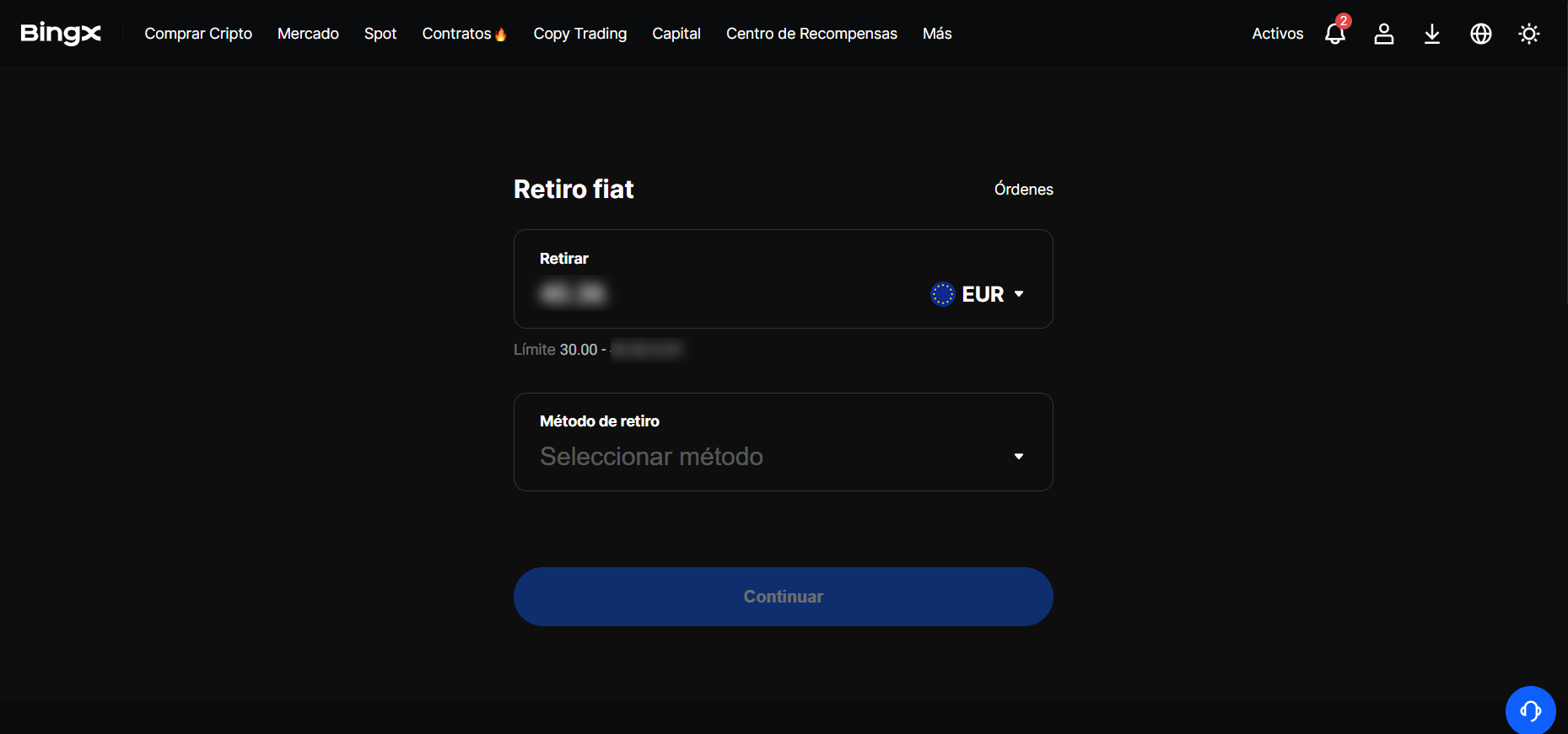 🔒 El dinero se acreditará en 1 o 2 días hábiles, según la opción que hayas elegido. Si surge algún inconveniente, deberás contactar al soporte de BingX. Puedes hacerlo desde cualquier página: en la esquina inferior derecha encontrarás un botón azul para iniciar el contacto.