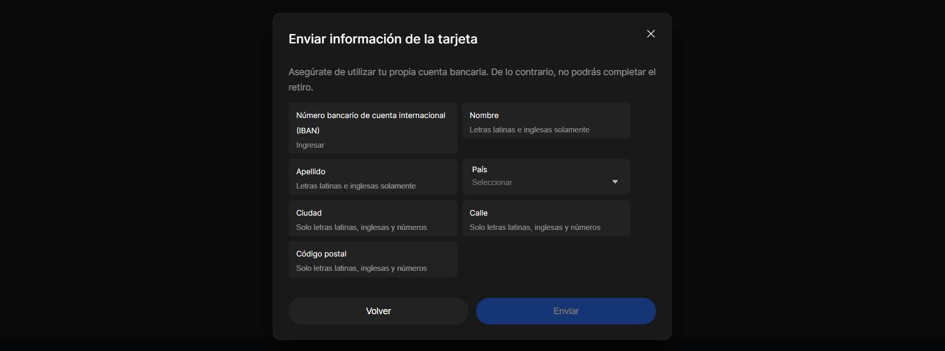 8º Completamos la información solicitada y verificamos que todos los datos sean correctos para evitar cualquier pérdida de fondos. Luego, pulsamos en Enviar.